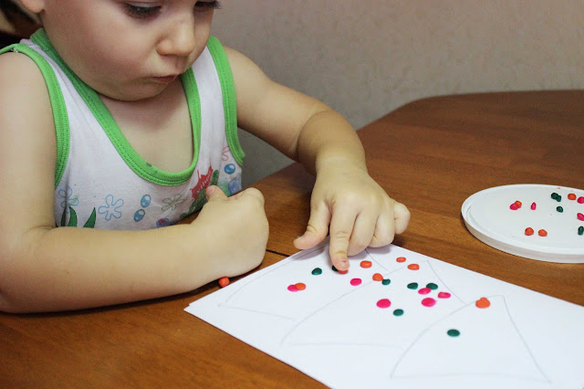 А следующее занятие увидела совсем недавно в блоге Ни минуты покоя. Вот уж не думала, насколько простое занятие может так увлечь карапуза. Из обычного пластилина накатала маленькие комочки. И дала Андрею "елочку украсить". Офигенное занятие для мелкой моторики: